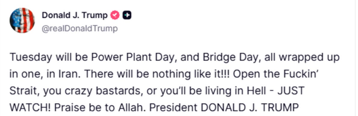 Then Trump threatened bridges and power plants if Iran fails to agree to a ceasefire, culminating in a very angry message below
