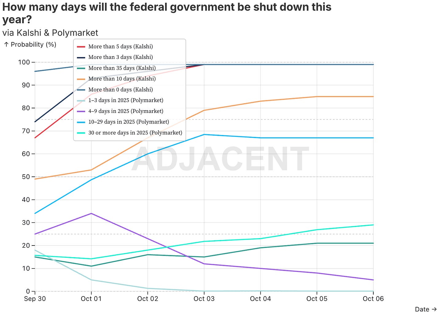 However, looking at the Adjacent aggregate, we are in for a long one - traders feel confident that we will see at least 10 days of shutdown with nearly 30% chance for over 30 days!