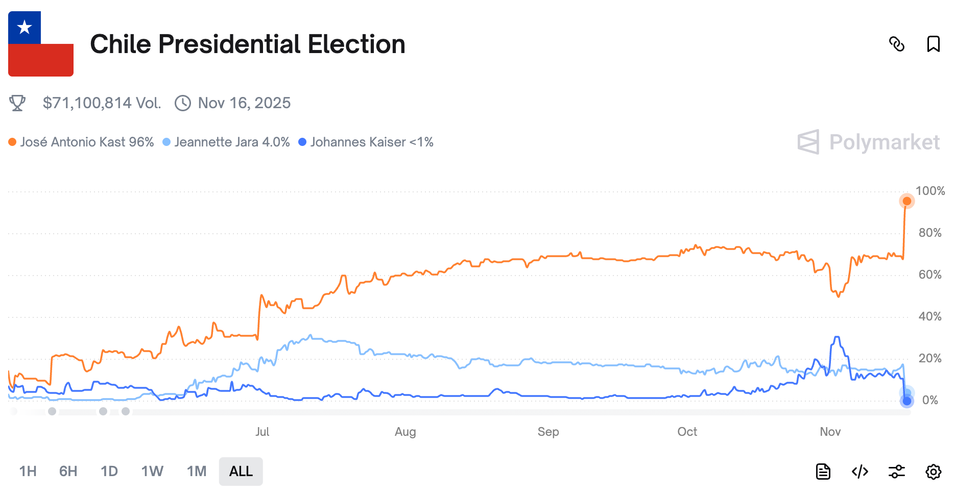 We had a first round presidential election in Chile, where as expected José Antonio Kast will face Jeannette Jara. Right wing Kast is expected to decisively win against his communist opponent:
